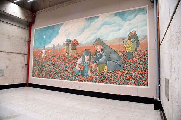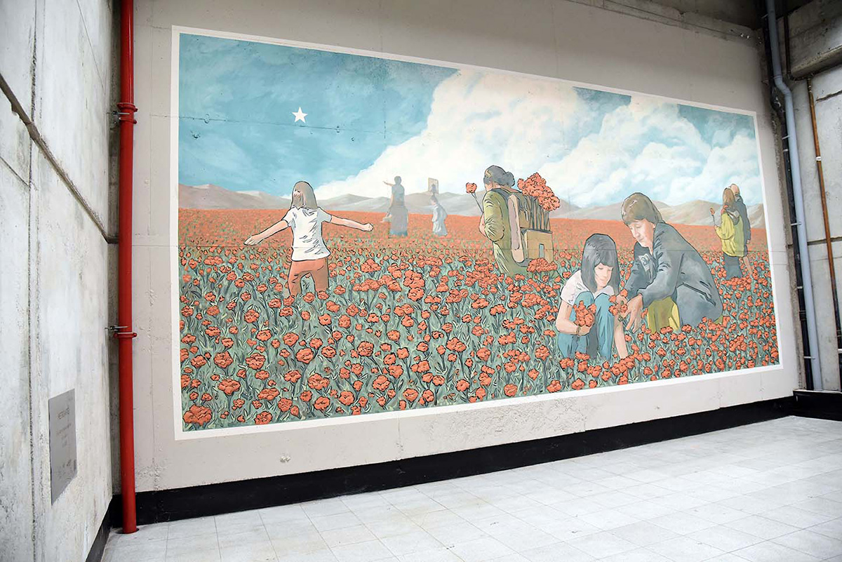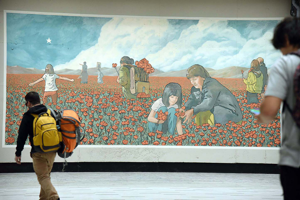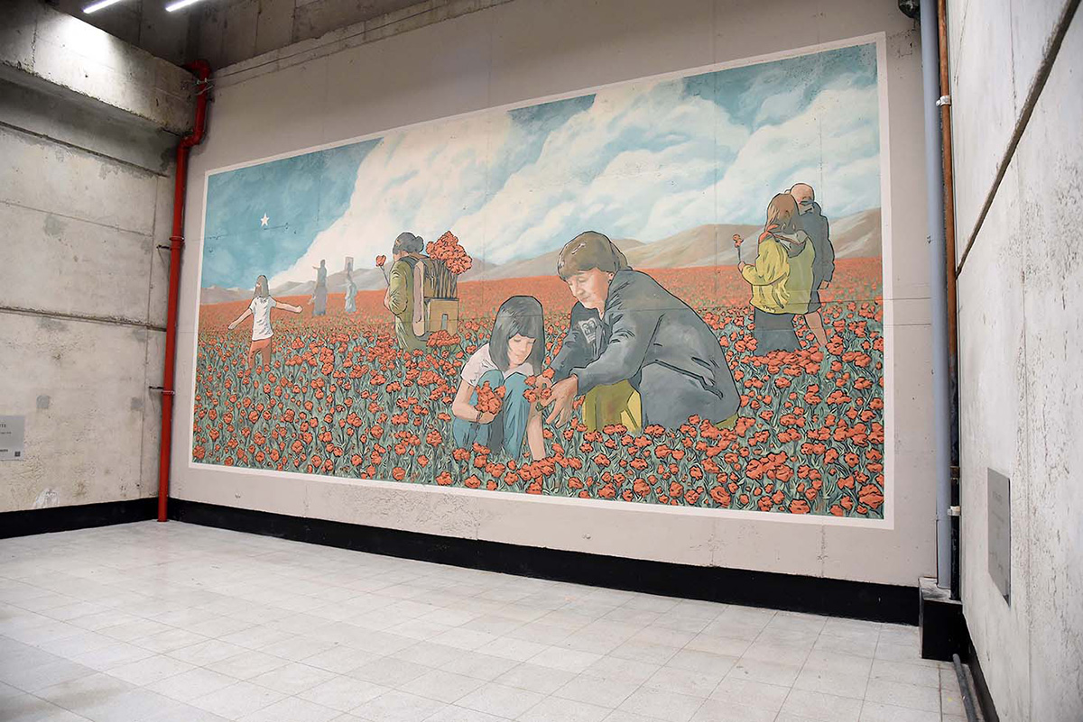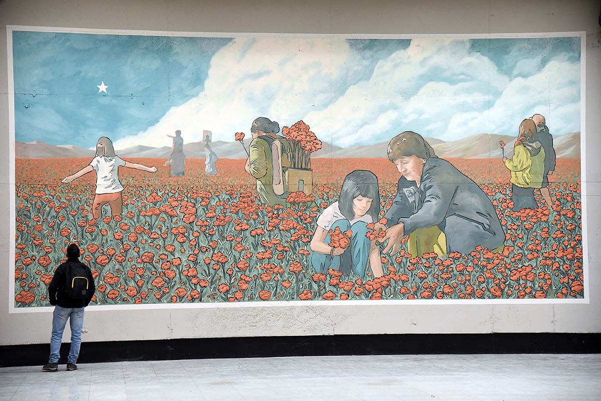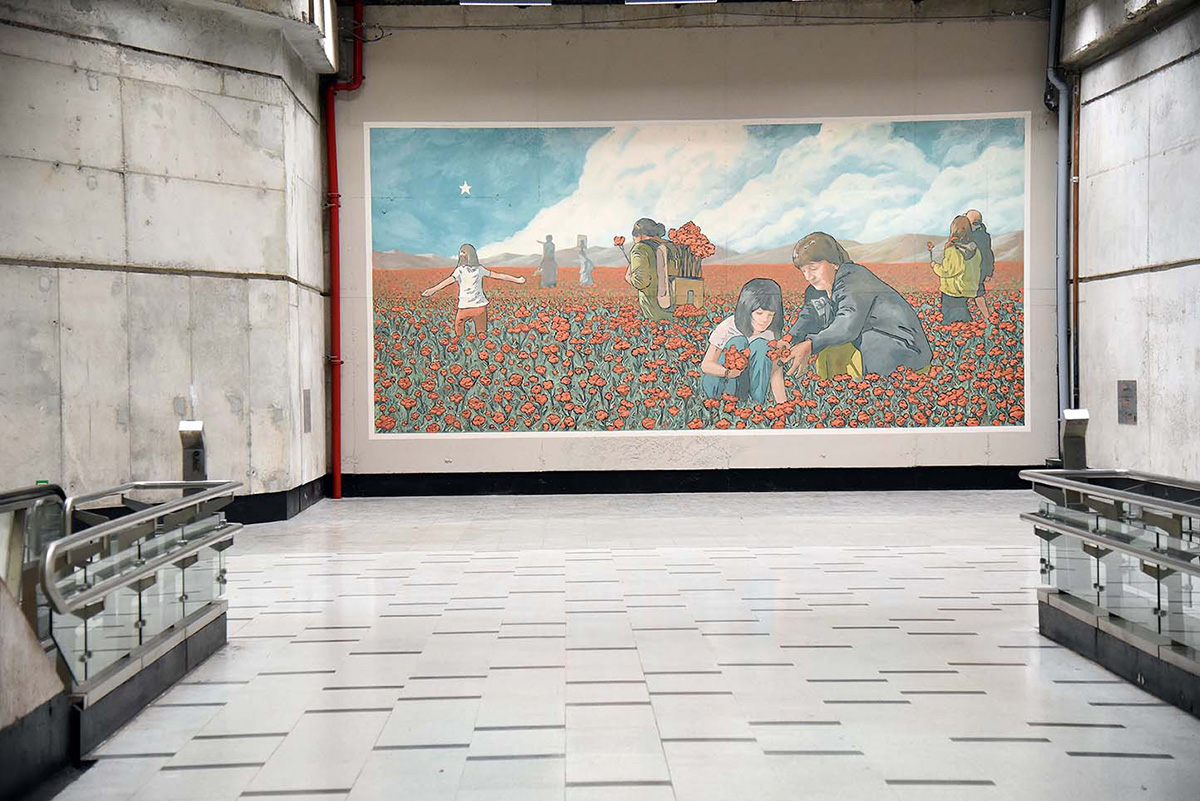 La obra "40 mil claveles y más, fuimos, somos y seremos" realizada por el destacado artista urbano Giova, trata de una creación artística de gran formato, disponible para todas las personas en el espacio público gracias a la alianza y colaboración entre la Seremi de las Culturas, las Artes y el Patrimonio Metropolitano, con el Estudio Lira Arte Público y el Metro de Santiago.