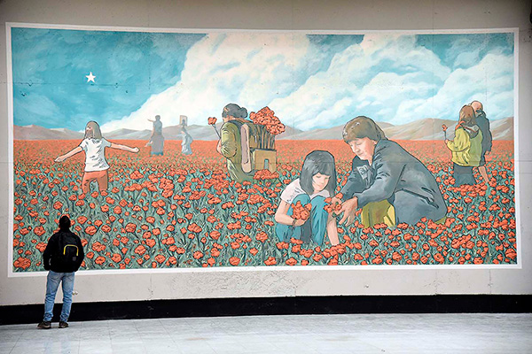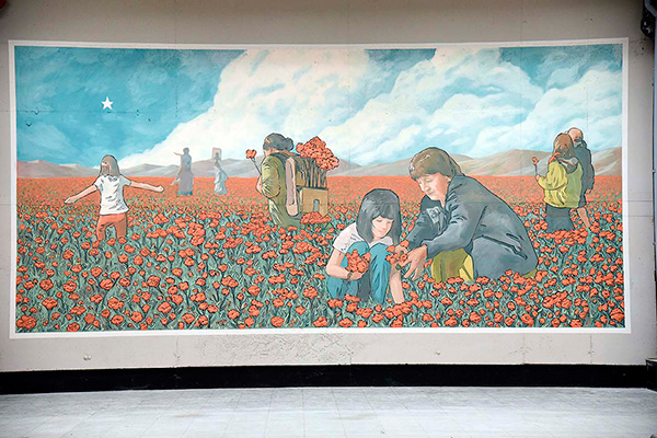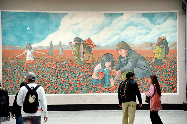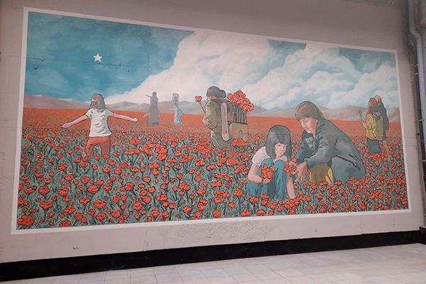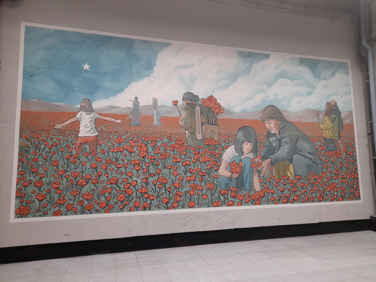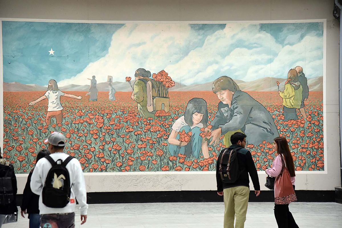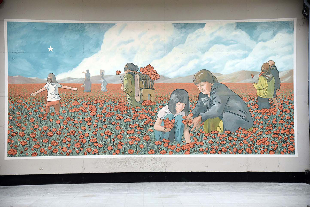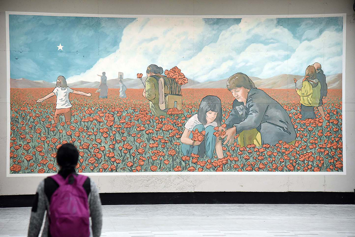 La obra "40 mil claveles y más, fuimos, somos y seremos" realizada por el destacado artista urbano Giova, trata de una creación artística de gran formato, disponible para todas las personas en el espacio público gracias a la alianza y colaboración entre la Seremi de las Culturas, las Artes y el Patrimonio Metropolitano, con el Estudio Lira Arte Público y el Metro de Santiago.