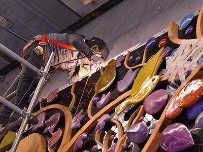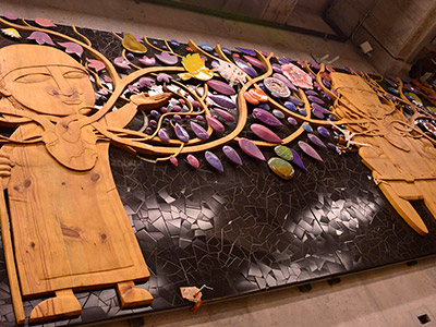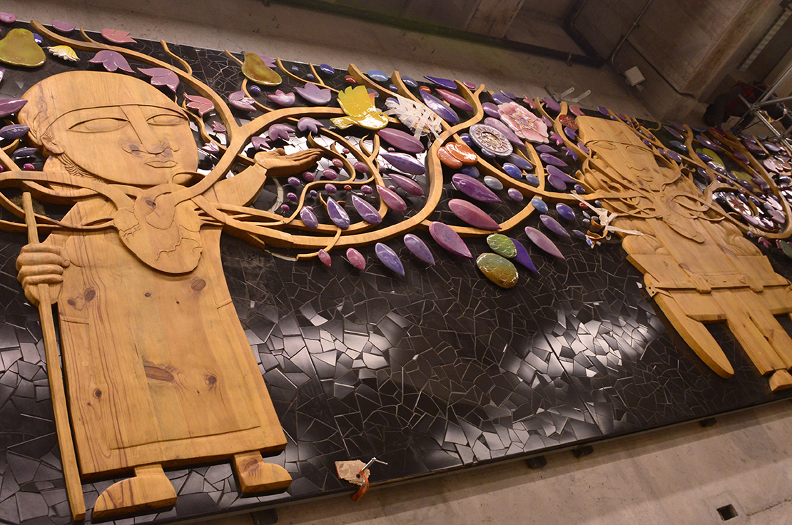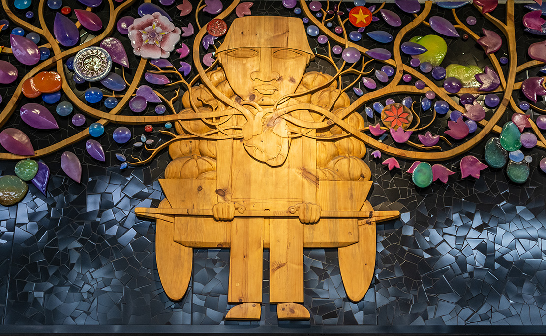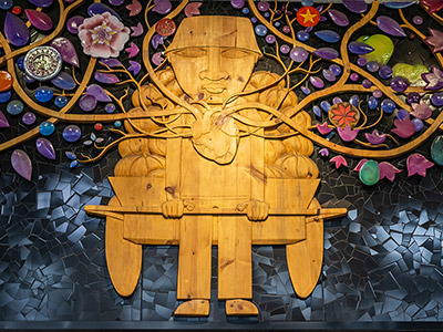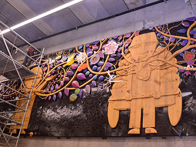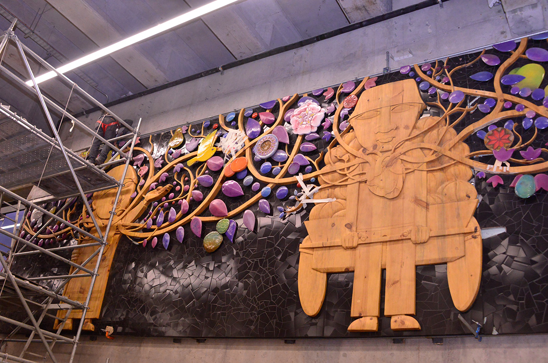 Autor: Ian Pierce Técnica: Talla sobre madera, cerámica policromada en volumen, mosaicos y pintura Superficie: 68 m2 Fecha: 2018