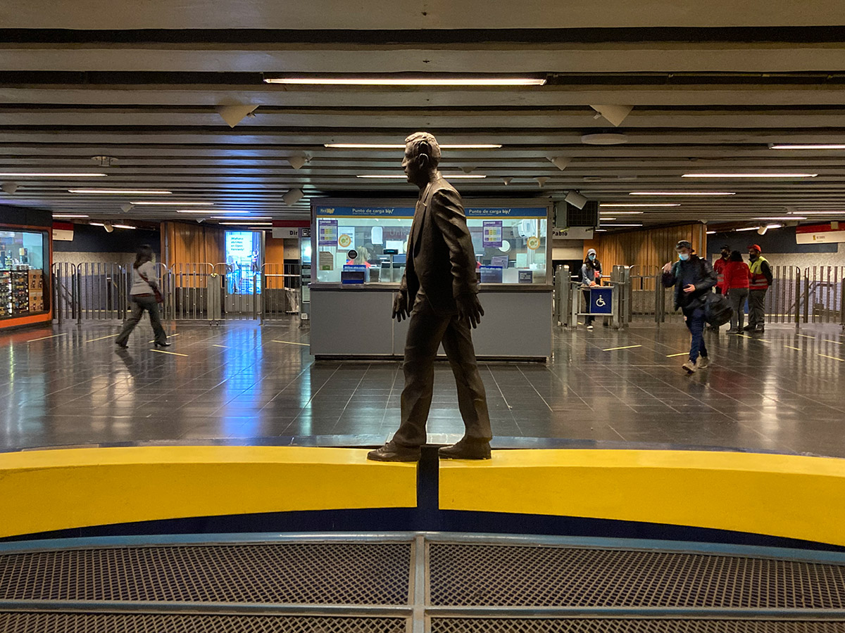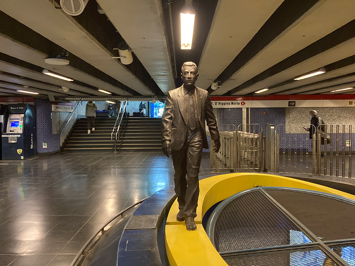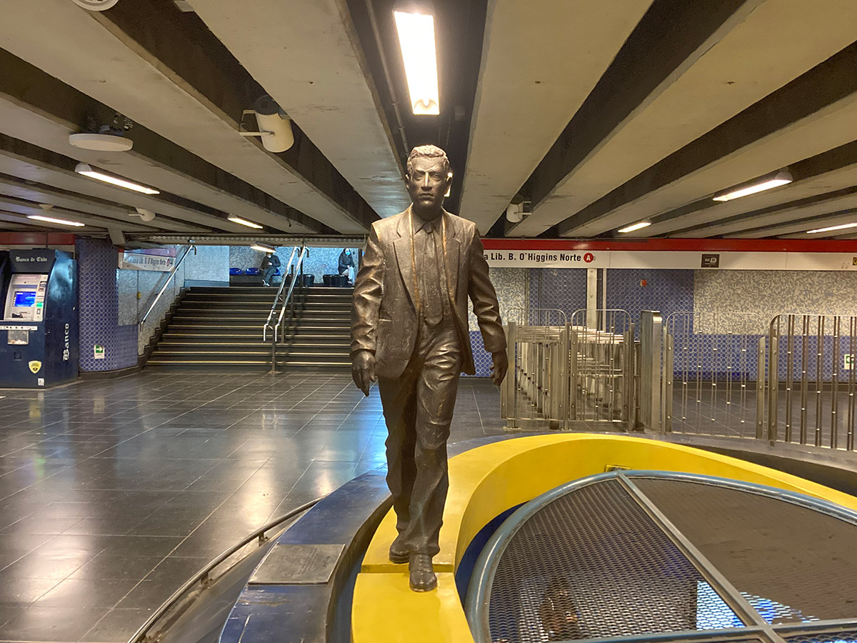 "¿Qué viaje hago yo en el Metro? Es un viajo corto, doméstico, diario, rutinario, repetido. Por eso hice un pasajero". Para realizar la obra El Viaje, una escultura de metal oscuro, primero tuvo que tomar el lugar, tomar posesión de ese espacio, ocuparlo físicamente. Se desarrolló pensada para instalarse en Pedro de Valdivia, pero paradójicamente la obra tuvo su propio viaje hacia su destino definitivo: Universidad Católica en L1.