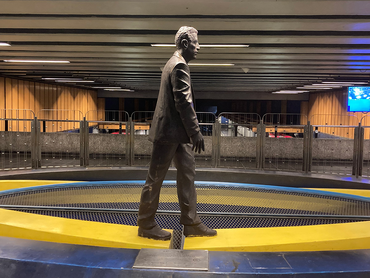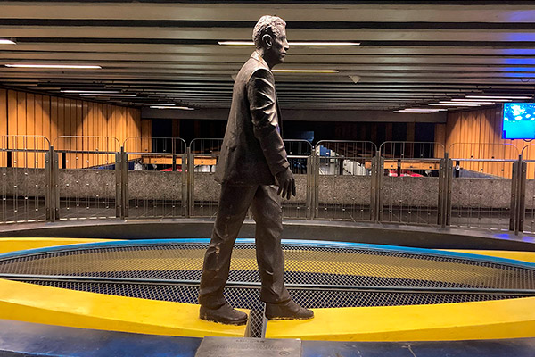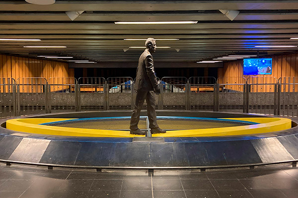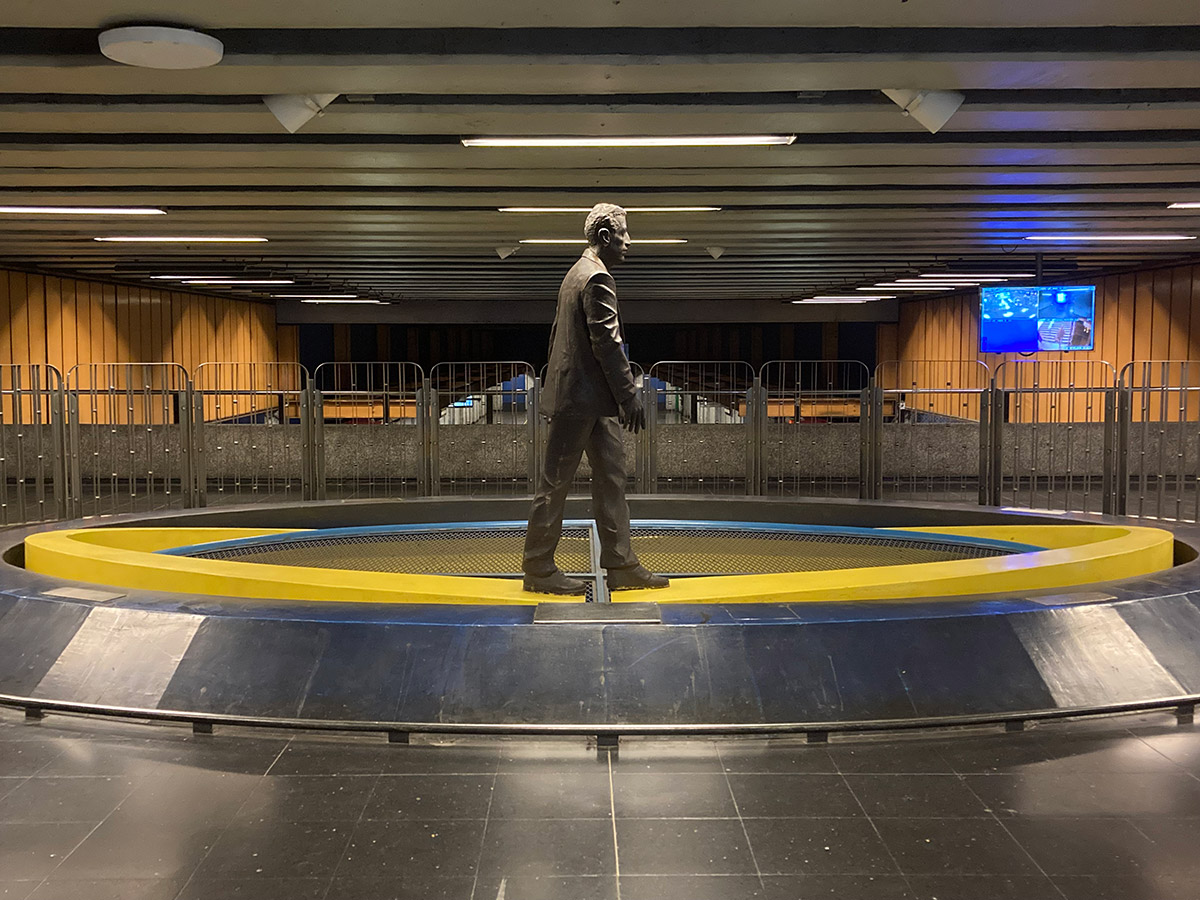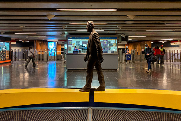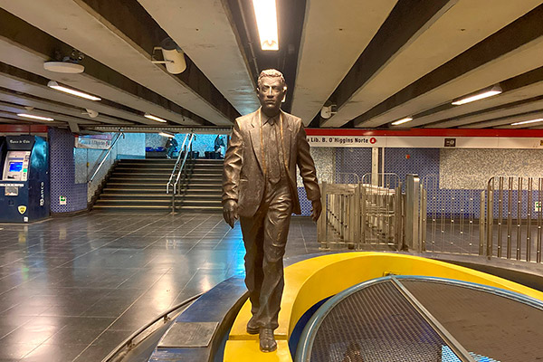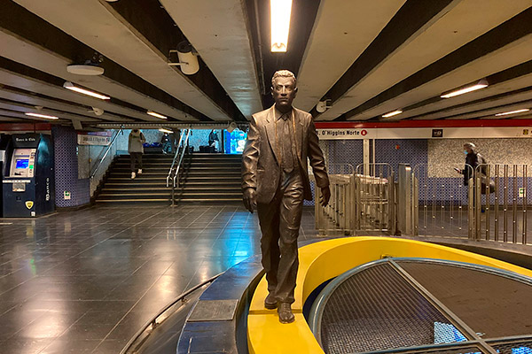 "¿Qué viaje hago yo en el Metro? Es un viajo corto, doméstico, diario, rutinario, repetido. Por eso hice un pasajero". Para realizar la obra El Viaje, una escultura de metal oscuro, primero tuvo que tomar el lugar, tomar posesión de ese espacio, ocuparlo físicamente. Se desarrolló pensada para instalarse en Pedro de Valdivia, pero paradójicamente la obra tuvo su propio viaje hacia su destino definitivo: Universidad Católica en L1.