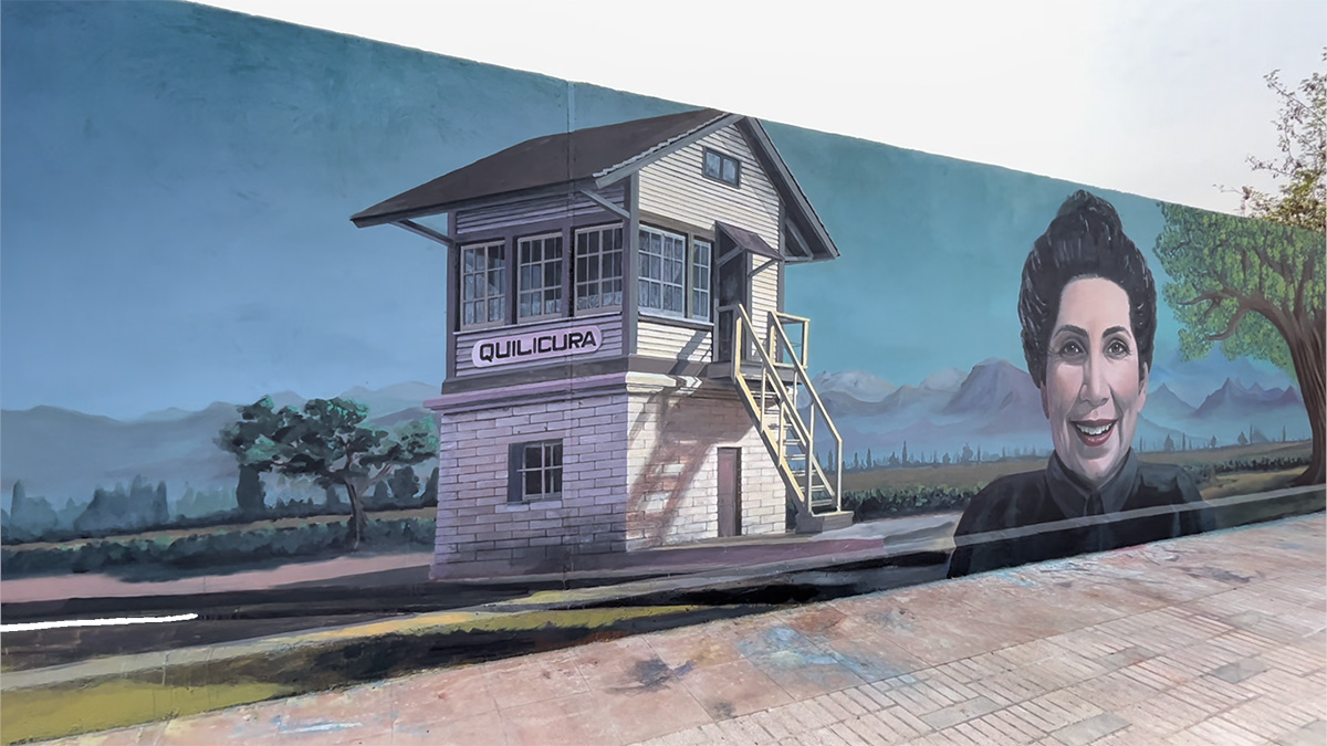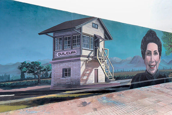 Santiago al puerto de Valparaíso. Es un paisaje que presenta a la línea férrea, la estación y la cabina de movilización con sus respectivas palancas, las que permitían cambiar de vía a los trenes. También representa una locomotora a vapor con algunos carros de la época. A Quilicura tenía un límite oriental que conectaba Santiago con Valparaíso. Es por eso por lo que pasó a tener tanta importancia para la época, ya que representaba el único método de movilización para el sector. Un hombre y una mujer representan en esta obra a la comunidad de Quilicura, simbolizando el valor de la conectividad para las personas que hoy está más presente aún.