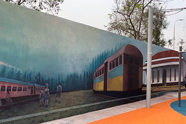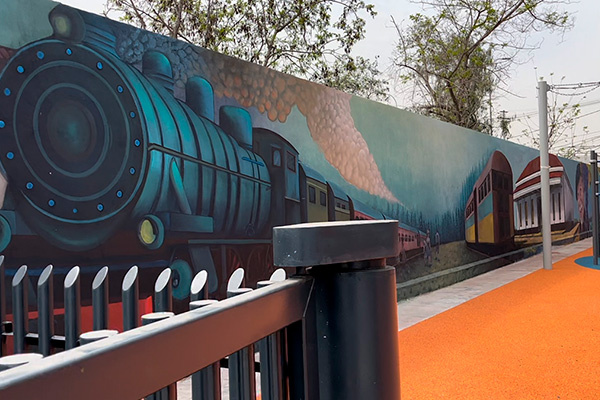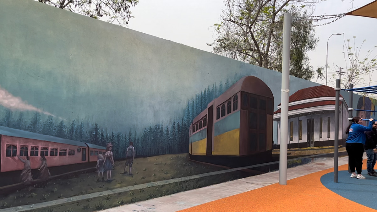 Autor: Claudio Solorza con el apoyo del taller de muralismo de Quilicura Técnica: Pintura sobre tablero Superficie: 120 m2 Fecha: 2023