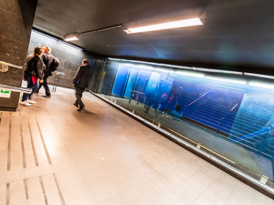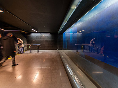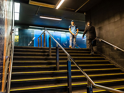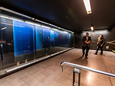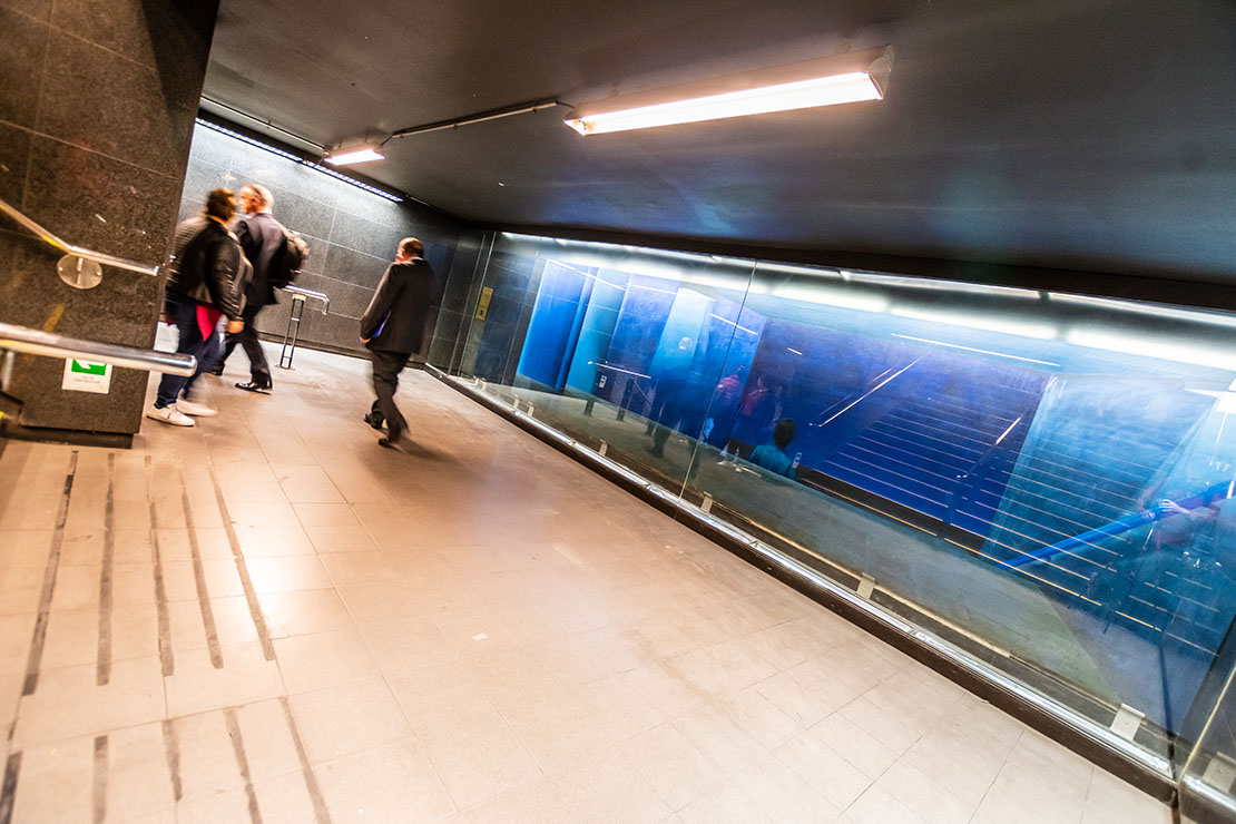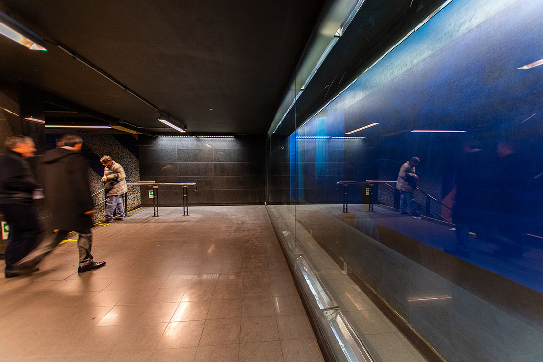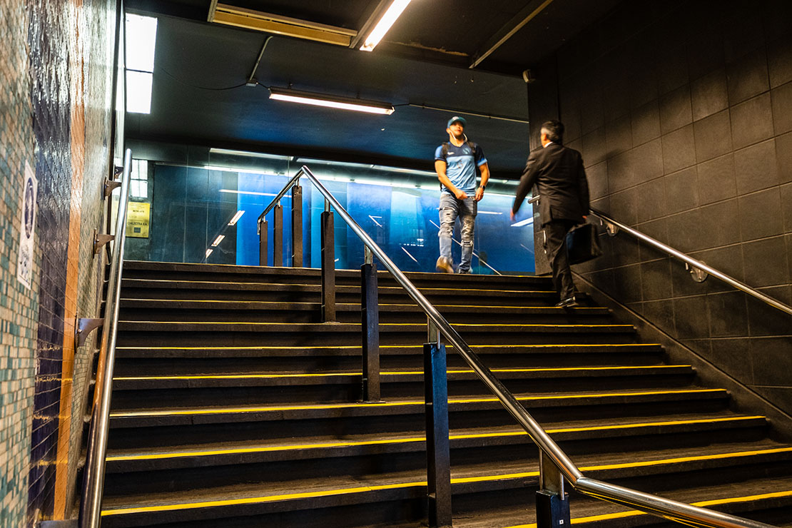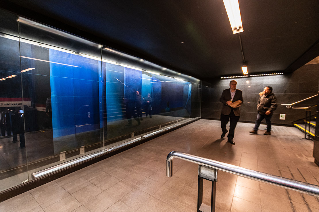 Es el primer MetroArte de la red. Con la técnica del óleo sobre tela, Hernán Miranda retrata al pasajero más fiel de Metro. Esa figura humana que desciende hacia una profundidad azul representa a los miles de ciudadanos que día a día bajan al andén. "Yo soy ese personaje que baja esas escaleras. Yo soy ese viajero, el protagonista de ese espacio como infinito". Con esas palabras Miranda evidencia su fascinación por los espacios de la ciudad, la que creció cuando fue invitado a ser el pionero del gran proyecto MetroArte.