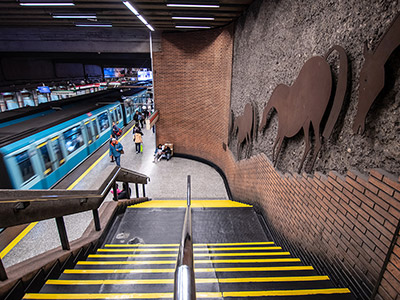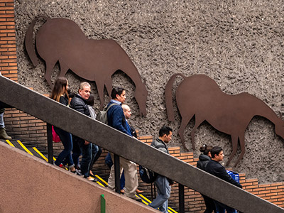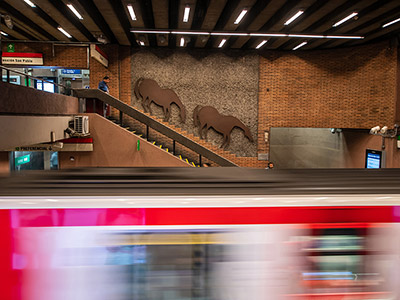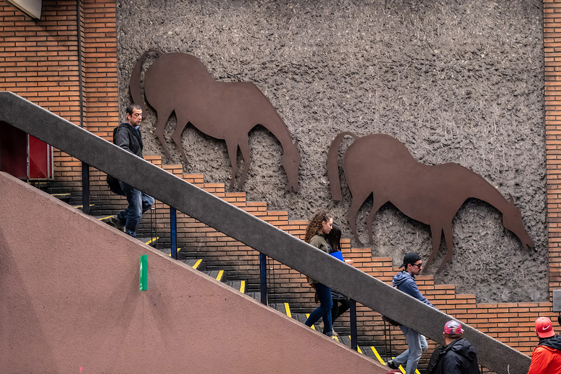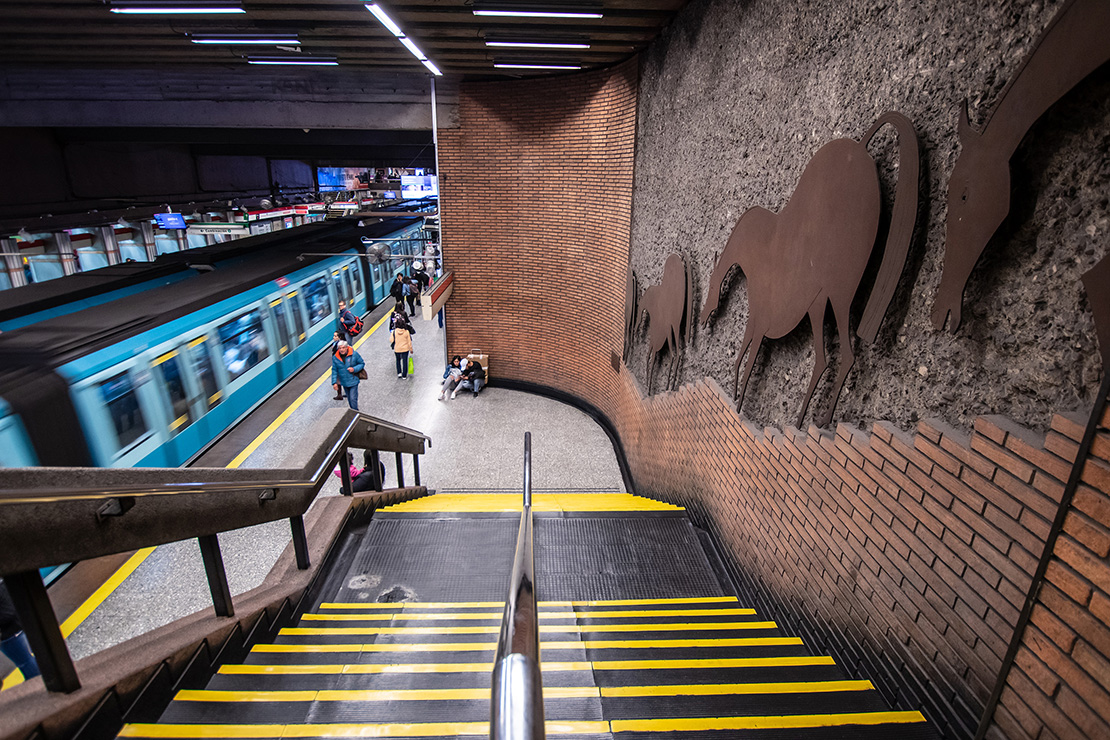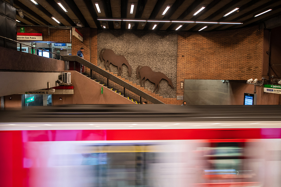 Una manada de caballos de fierro oxidado bajan junto a los seres humanos de carne y hueso por la escala principal de Baquedano en L1. "Lo que me seduce de ellos es su mezcla de elegancia con un temperamento muy vital". Por eso Pinto les dio a los caballos un protagonismo especial: 180 metros cuadrados de planchas de acero recortadas con formas de caballo y sometidas a un tratamiento de oxidación estabilizado. En esos caballos hay un juego onírico, el ritmo y la velocidad de los pasajeros que se apuran al encuentro del tren.