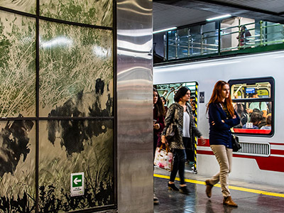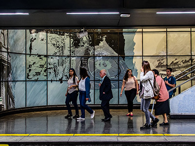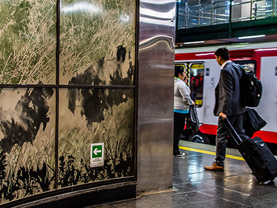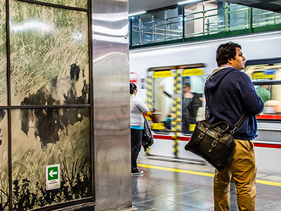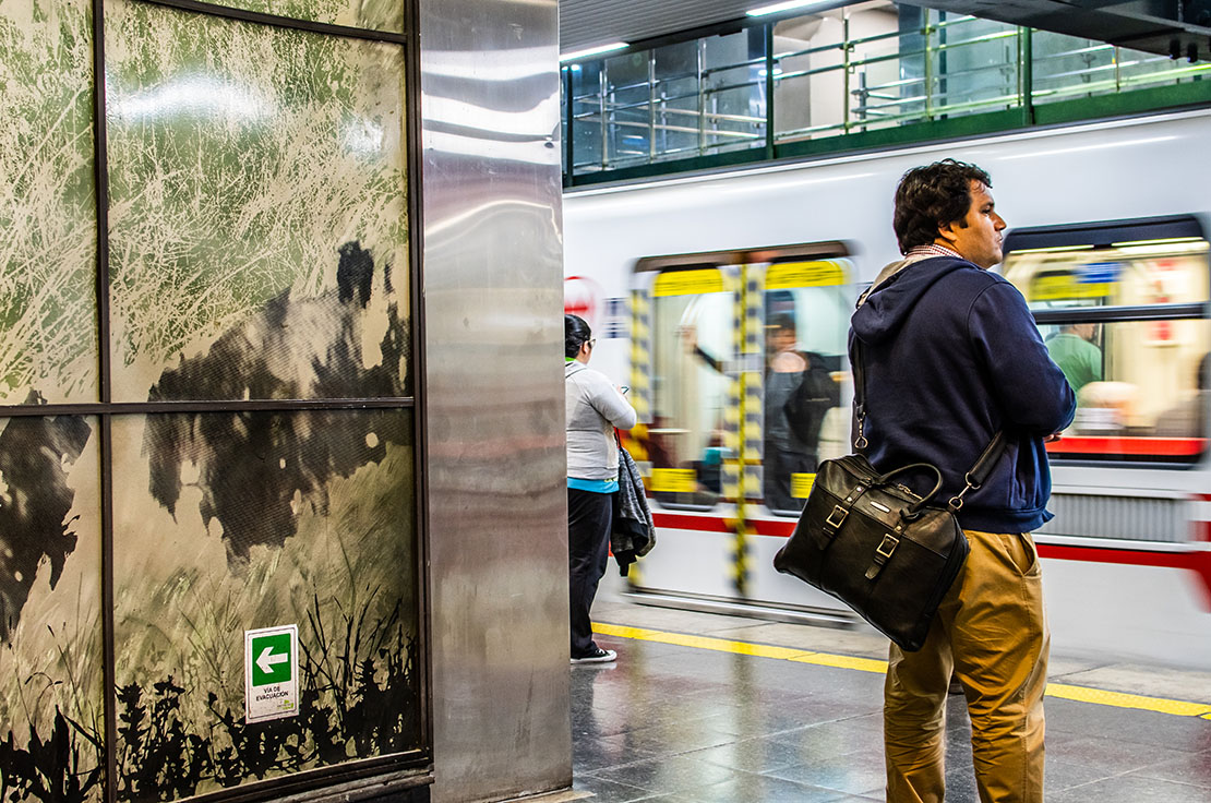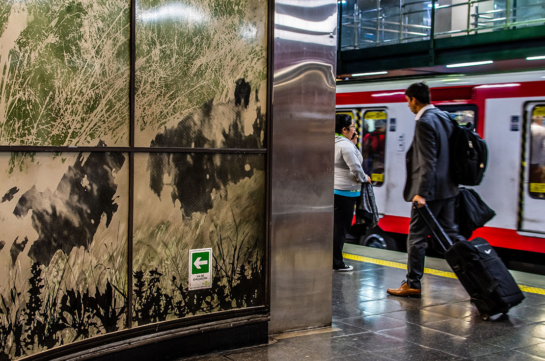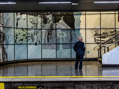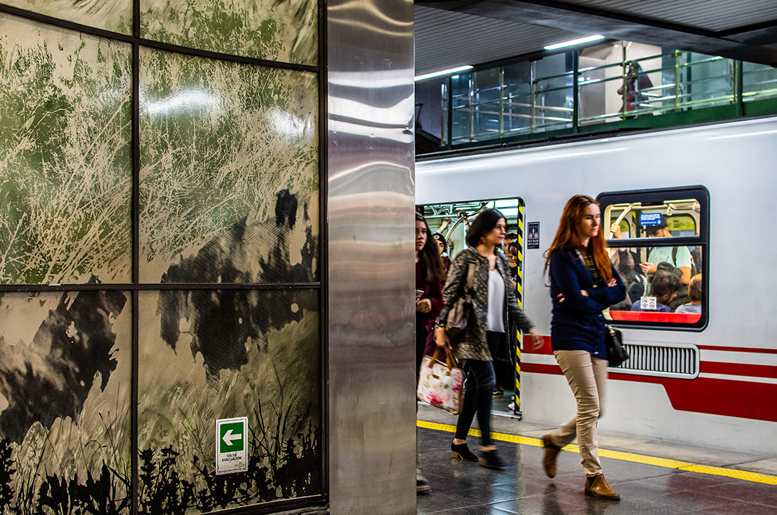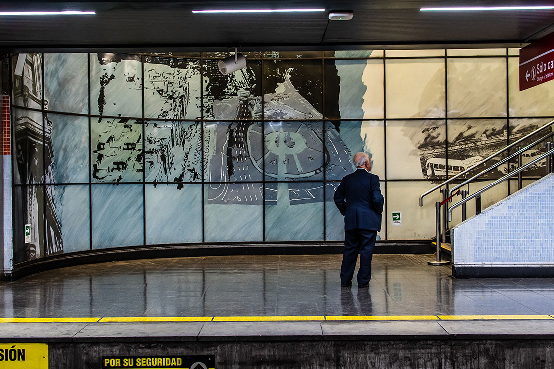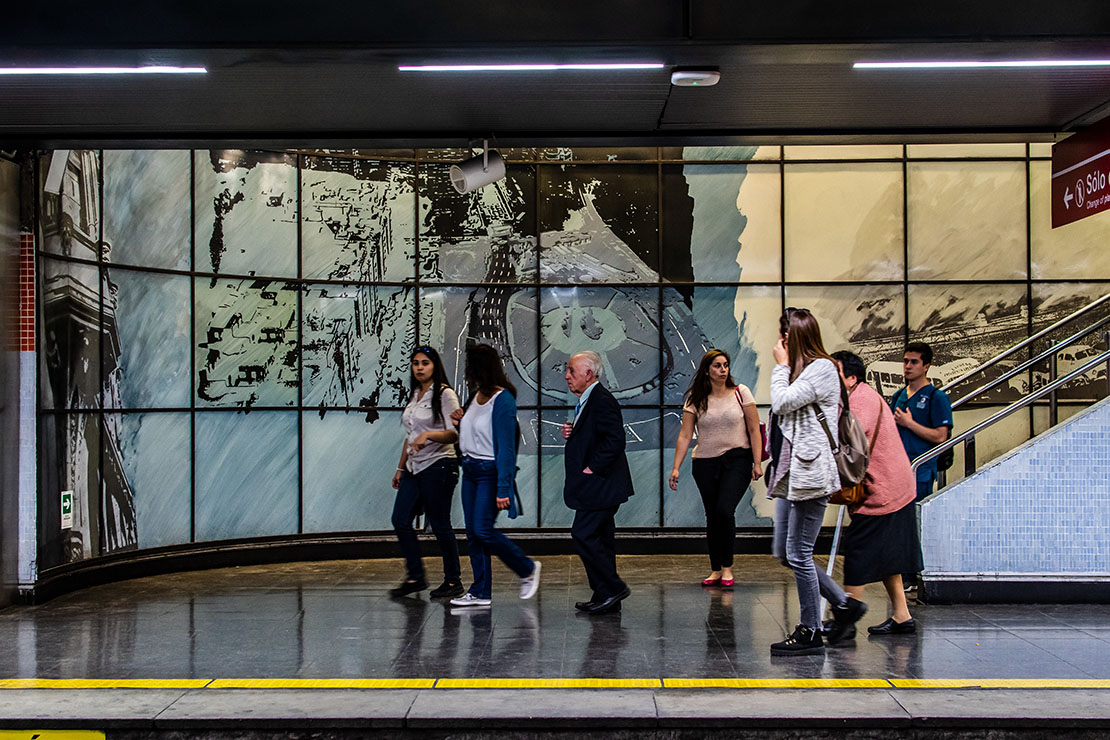 Las ciudades no sólo son fundadas y construidas. También son fotografiadas, contadas, imaginadas, pintadas y reinventadas. Muchas veces esa reinvención artística de la ciudad es la que perdura más allá de la real. Ese es el concepto de Zamudio para crear los cuatro murales sobre Santiago de la estación. Metal esmaltado fue la técnica para la posteridad: "la única certeza que tengo es que se podrá caer la estación pero esta obra va a estar ahí".