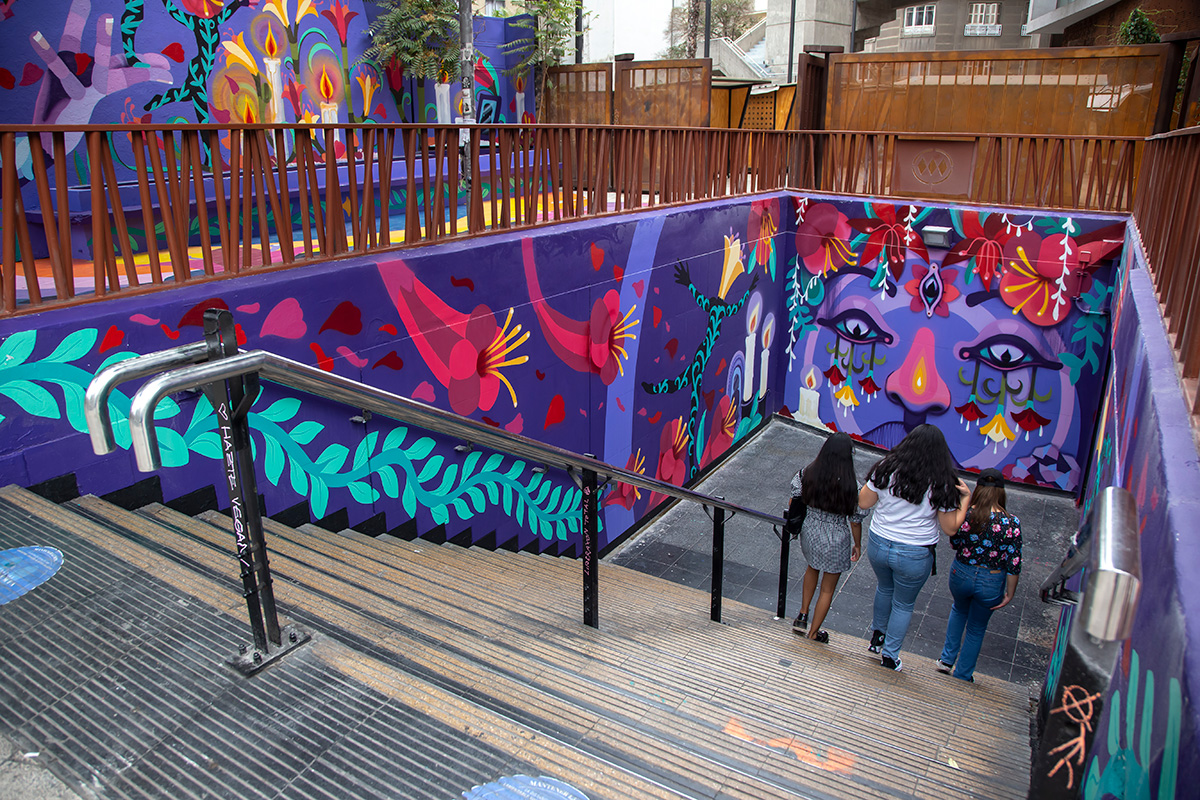 Este MetroArte fue realizado con el aditivo Photio incorporado a la pintura, una innovadora nanotecnología chilena se agrega a la pintura, realizando una acción purificadora del aire equivalente 600 árboles adultos.