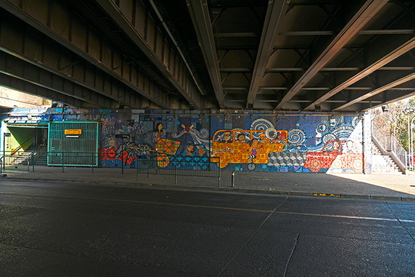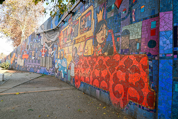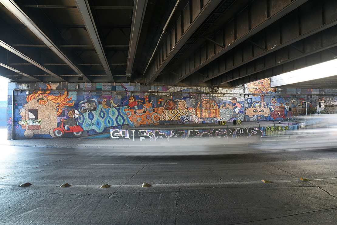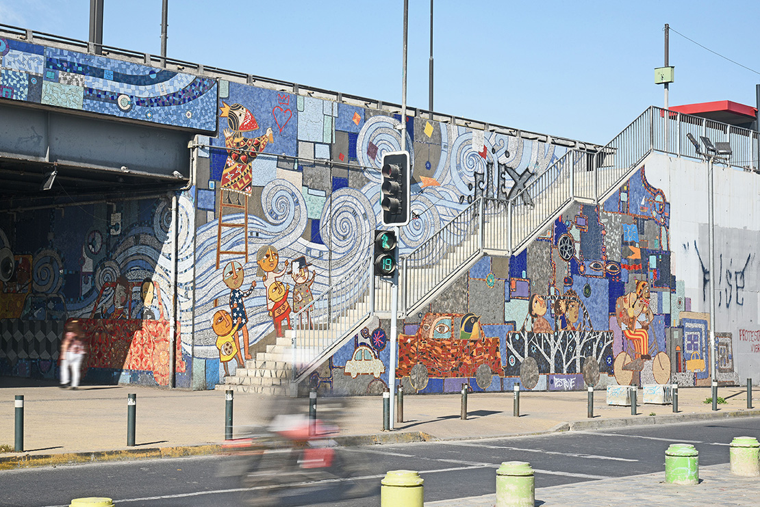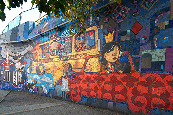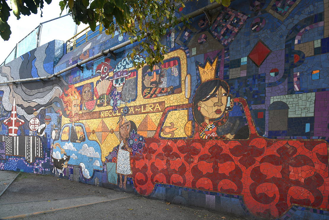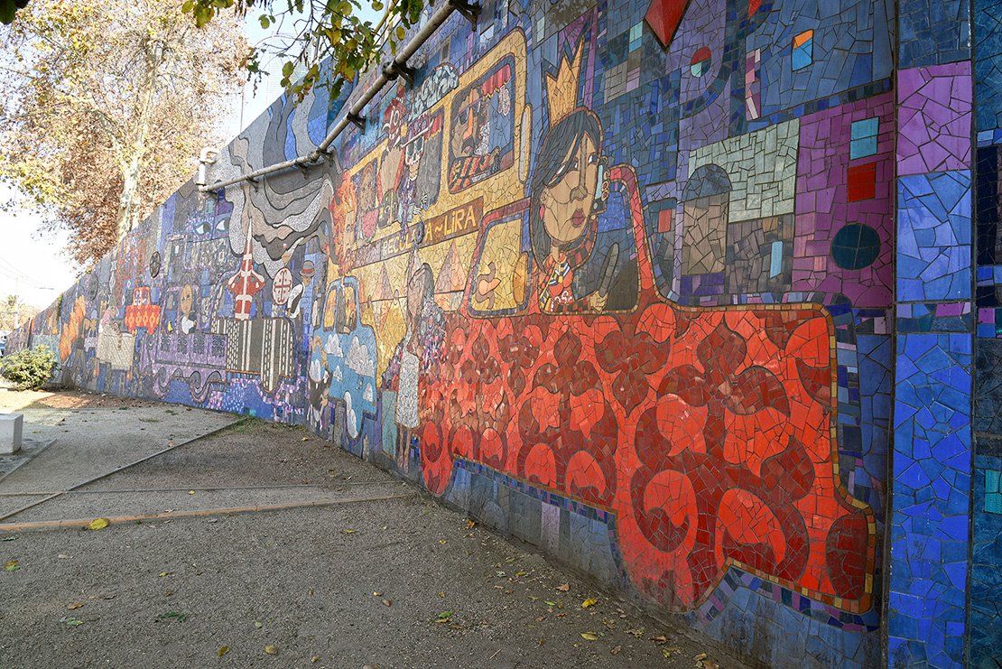 La creación de este mural tardó un año aproximadamente. Son en total 720 metros cuadrados de mosaico realizado por Ian Pierce "Ekeko".