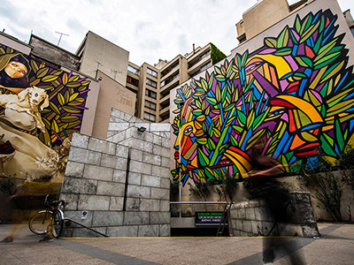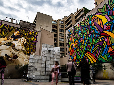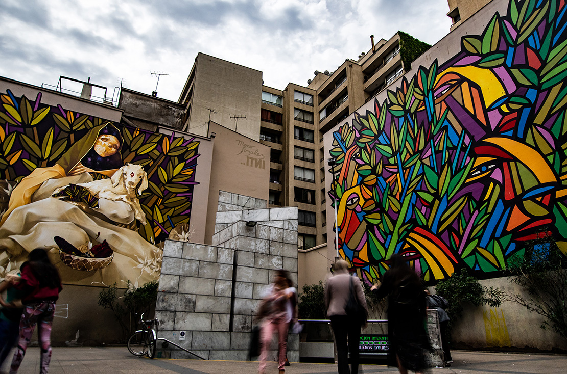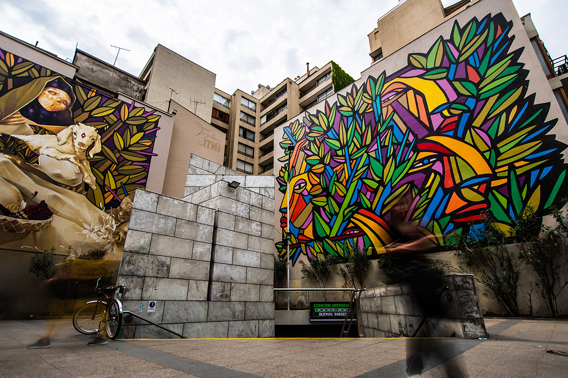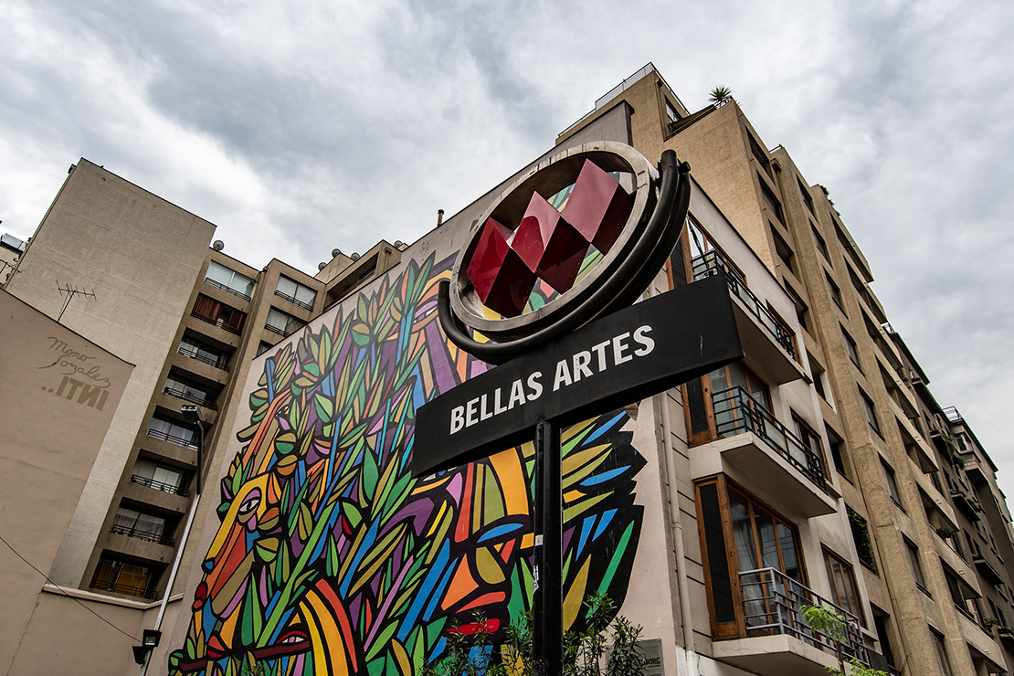 Fueron los cinco días del Festival Urbano Barrio Arte los que permitieron que el acceso de la estación Bellas Artes se tiñera de color, de vida y de arte. Acercar a los ciudadanos obras de artistas consagrados sin necesidad de pagar una entrada o ingresar a una galería o museo. Ese fue el norte de los artistas Inti Castro y "Mono" Gonzalez, que alcanzaron después de varias jornadas de trabajo a vista, paciencia y asombro de los peatones. Figuras y motivos latinoamericanos hoy llegan a la ciudad para instalarse, colorear y darle dinamismo a uno de los barrios más emblemáticos de Santiago.