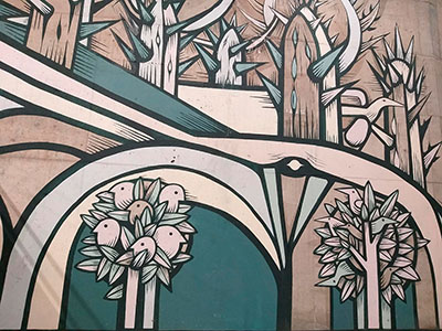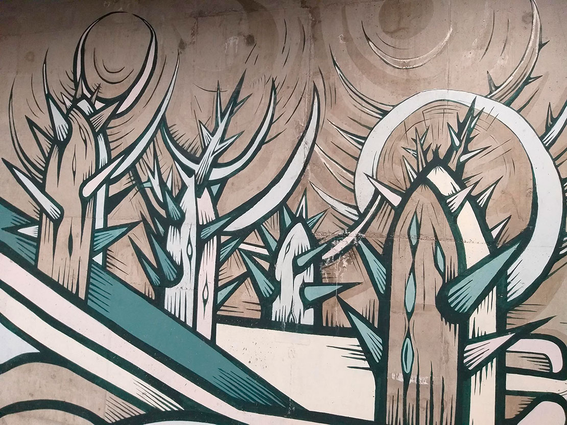 El muralista creador de esta pintura sobre hormigón abarca tres temáticas: el hombre y su relación con el espacio natural y el espacio urbano; la naturaleza representada en cactus; y la libertad y vida silvestre simbolizada a través de pájaros.