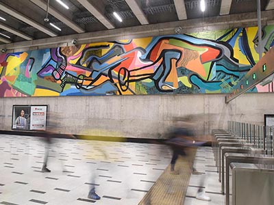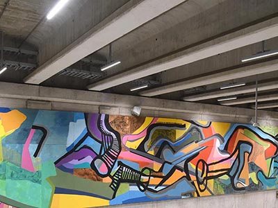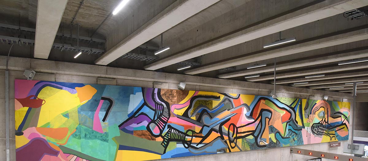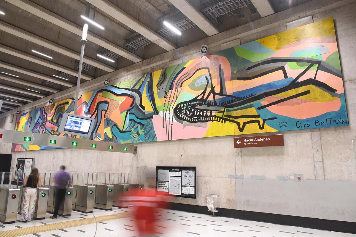 Autor: Ciro Beltrán Técnica: Pintura acrílica en madera terciada Superficie: 100 m2 Fecha: 2020