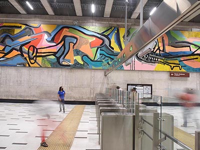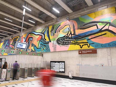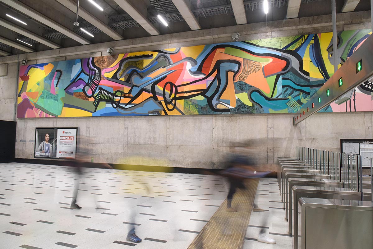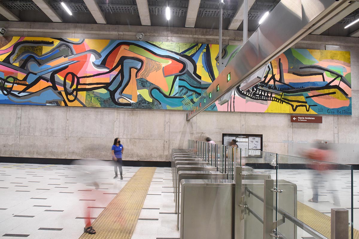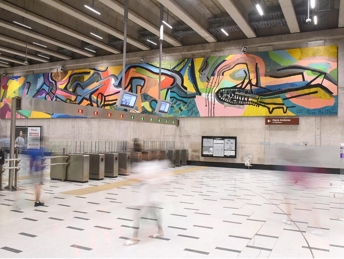 Este proyecto MetroArte realizado junto a Banco Santander busca acercar a los pasajeros a la cultura y el arte local con un colorido diseño abstracto, de carácter geométrico y arquitectónico, y en el que su iconografía guarda relación con una obra urbana del mismo autor, "Muro de Los Leones", que estuvo presente en la vida de los ñuñoínos, desde 1986 a 1998, en una a larga pared de avenida del mismo nombre, entre Sucre y Simón Bolívar. De esta manera, este MetroArte en estación Chile-España rescata un conjunto de figuras y murales de la niñez y juventud del artista, que contribuyen a la identificación y vinculación con el barrio.