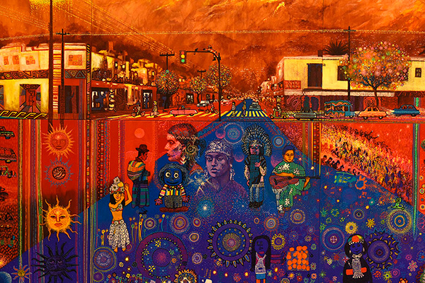 Autor: Taller de Artes Plásticas Corp. Cultural La Reina guiado por Leonardo Valdés Técnica: Mural sobre tablero Superficie: 20 m2 Fecha: 2021